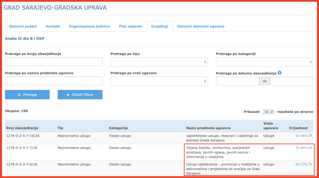Pored toga, zanimljivo je što su istom nabavkom spojili javne objave koje građanima mogu biti administrativno važne i sadržaje koji prvenstveno služe javnoj vidljivosti institucije – u istoj nabavci se uz objave javnih poziva i drugih službenih informacija, nalaze i čestitke, smrtovnice i slični sadržaji.