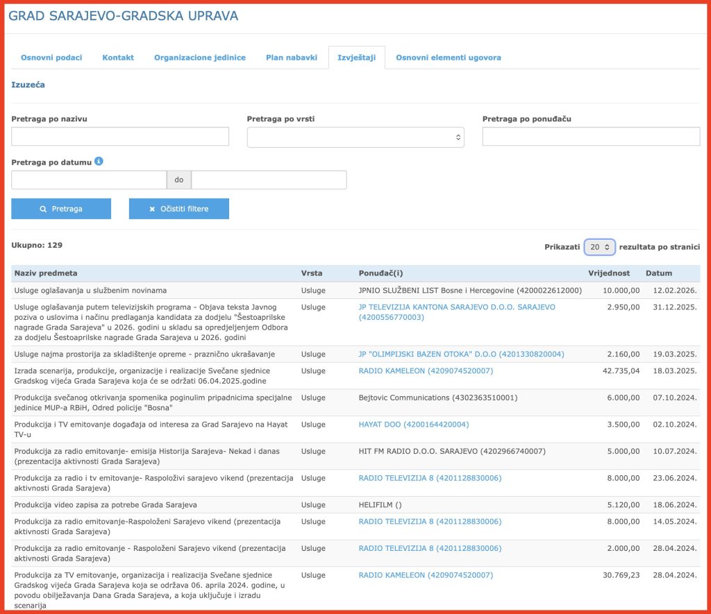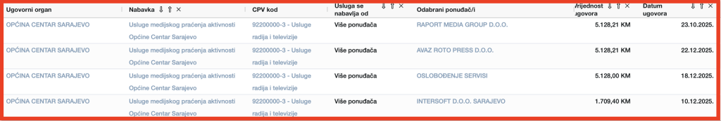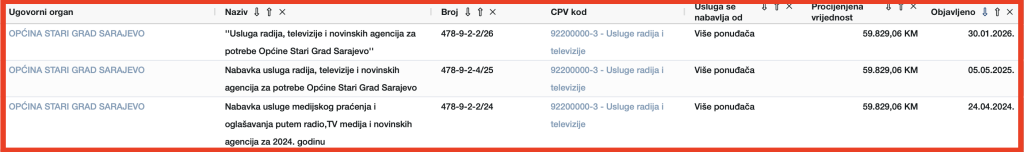 Spomenimo i Gradsku upravu Grada Sarajeva, koja također izdvaja značajna sredstva za medijsku promociju. Samo za “usluge oglašavanja – promocije u medijima o aktivnostima i projektima od značaja za Grad Sarajevo”, primjenjujući Aneks II Zakona o javnim nabavkama, u 2025. godini izdvojeno je gotovo 65.000 KM.