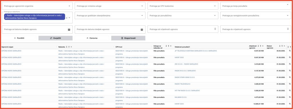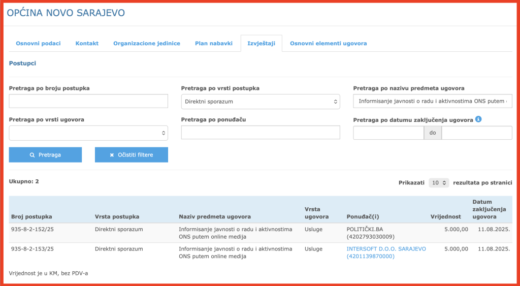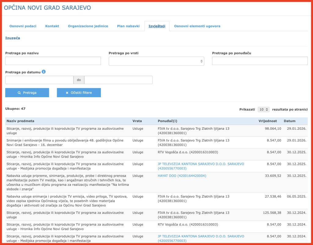 Konkretno, tokom 2025. godine Općina Novo Sarajevo je, primjenom Aneksa II, zaključila ukupno devet ugovora vrijednih više od 55.000 KM bez PDV-a s različitim medijima za „radio-televizijske usluge u cilju informisanja javnosti o radu i aktivnostima Općine Novo Sarajevo“. Dakle, i ovdje je riječ o finansiranju promocije rada institucije novcem građana.