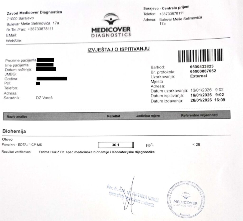 “Prisustvo olova u krvi predstavlja izuzetno kompleksan zdravstveni problem, jer u ljudskom organizmu ne postoji fiziološka potreba za olovom. Savremena medicina zastupa stav da ne postoji ‘sigurna’ doza olova u organizmu”, ističu stručnjaci iz Instituta za zdravlje i sigurnost hrane Zenica.