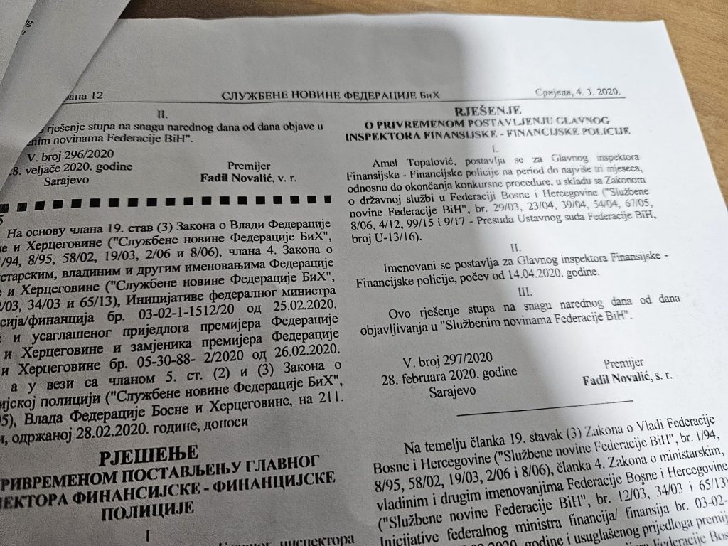 Ovo nam je potvrđeno i u Sekretarijatu Vlade FBiH, a uvidom u Službene novine je vidjljivo da je Topalović na ovu poziciju postavljen na period do najviše tri mjeseca, odnosno do okončanja konkursne procedure. U skladu sa Zakonom o državnoj službi FBiH, Topalović je poziciju glavnog inspektora počeo obavljati od 14. aprila 2020. godine.