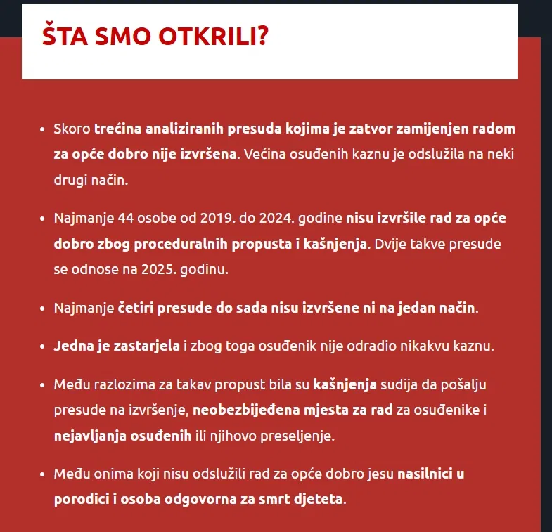 Među otkrićima je i to da Ministarstvo pravde u Republici Srpskoj nije u svim općinama sklopilo ugovore za izvršenje rada za opće dobro, zbog čega dvojica osuđenih 2023. i 2024. godine još uvijek nisu odslužili svoje kazne.