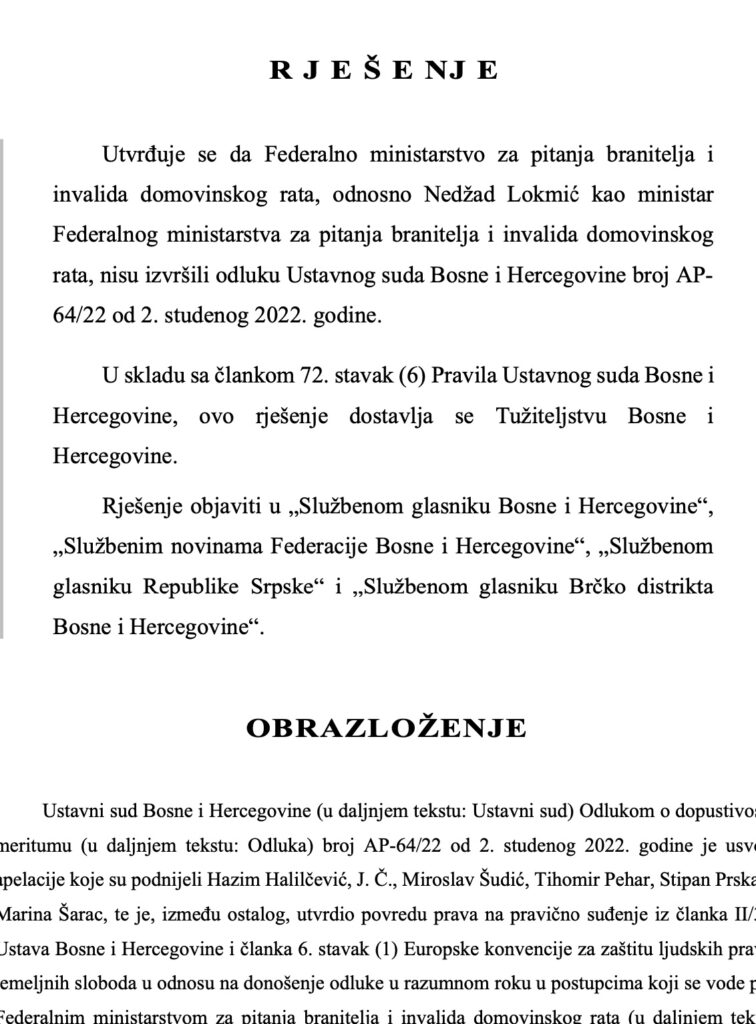 Ustavni sud Bosne i Hercegovine dostavio je Tužilaštvu BiH rješenje u kojem je utvrdio da Federalno ministarstvo za pitanje boraca i invalida domovinskog rata odnosno Nedžad Lokmić kao ministar nisu izvršili odluku Ustavnog suda broj AP-64/22 od 2. novembra 2022. godine, piše Fokus.ba.